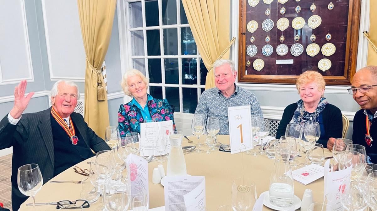 Decadence was the order of the day for dessert – white chocolate, pistachio and raspberry profiteroles! These were paired with Château Suduiraut 2010 1er Cru A.O.C. Sauternes. Commandeur Edwards noted that this wine was greatly enjoyed by all and if not definitely the best wine of the night was certainly one of the best two. Members noted hazelnuts, honey and marmalade on the palate and one person mentioned that the nose was reminiscent of and old cognac.