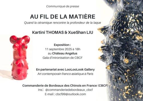 The Commanderie de Bordeaux des Chinois en France (CBCF), in partnership with LooLooLook Gallery in Paris, is honoured to present "Au Fil de la Matière," an exceptional artistic encounter held on September 11th, 2025, from 6 p.m. to 10 p.m., during its Gala Dinner at the prestigious Château Angelus in Saint-Emilion.