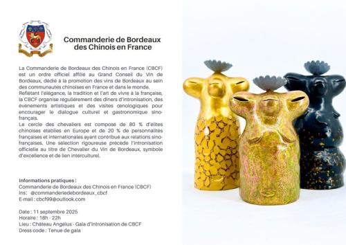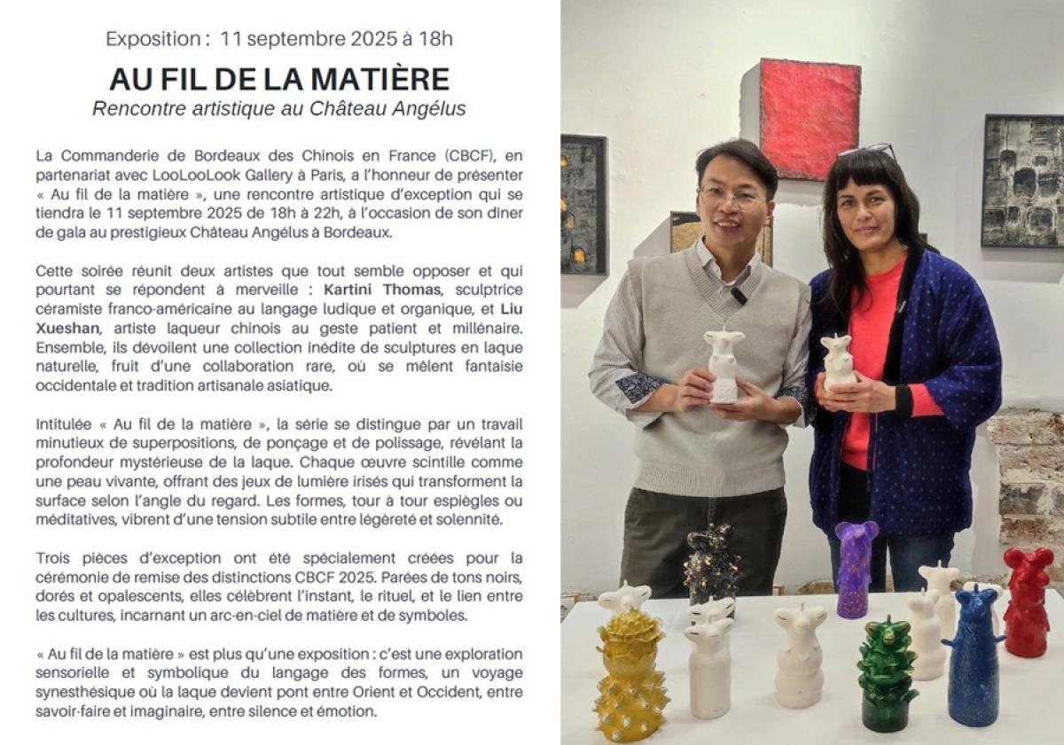 The Commanderie de Bordeaux des Chinois en France (CBCF), in partnership with LooLooLook Gallery in Paris, is honoured to present "Au Fil de la Matière," an exceptional artistic encounter held on September 11th, 2025, from 6 p.m. to 10 p.m., during its Gala Dinner at the prestigious Château Angelus in Saint-Emilion.