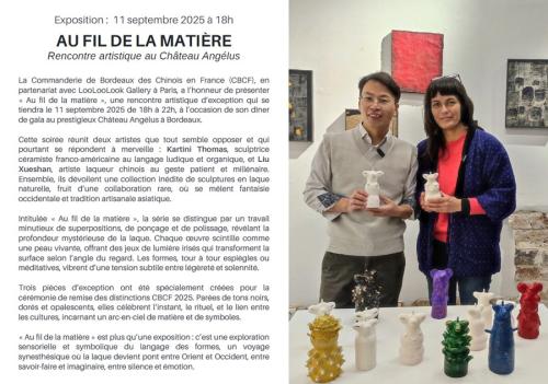 October 11, 2025Commanderie de Bordeaux of Chinese people living in France. Exhibition on September 11th, 2025, at 6 pm, “AU FIL DE LA MATIÈRE”, an artistic encounter at Château Angelus